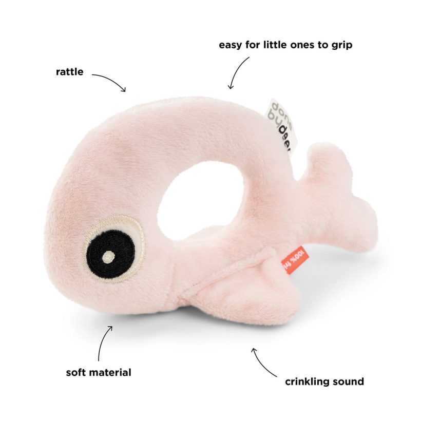 De zachte ring rammelaar maakt een schattig rammelgeluid wanneer het wordt geschud en de vinnen maken een grappig kreukend geluid wanneer ze worden aangeraakt. De vinnen maken het mogelijk dat de rammelaar op zichzelf kan staan en geschikt is voor buiktijd.